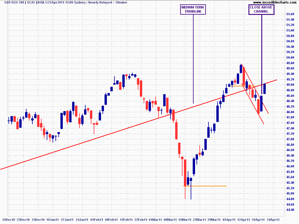 The S&P/ASX200 is back to its medium term trendline after closing yesterday above the down channel I drew on yesterdays chart.