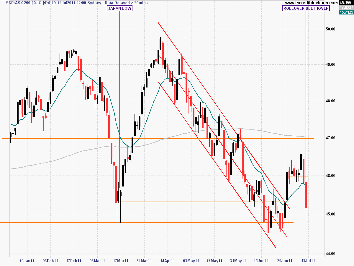 The daily chart shows yesterday’s reversal has turned into a “dead dog rollover” today (intraday, this rollover is stark!) with support at 4600 points failing completely. The next target level is approx. 4530 points (the closing low of the Japan Earthquake) and then 4475-4500 points (the lows reached in the recent correction).