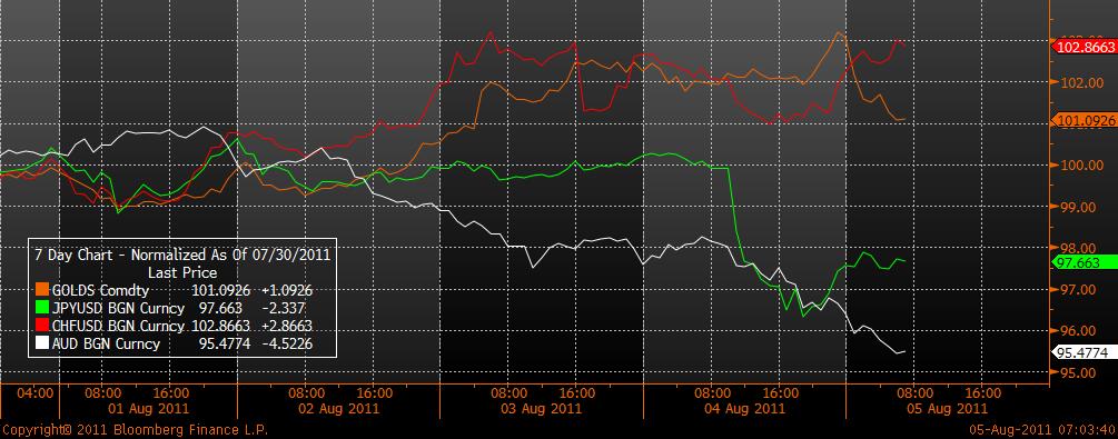 The chart above is of the hourly movements of the Aussie, Gold, Swissy and Yen this week indexed to 100. You can see that the Yen, which has been the beneficiary of intervention and the Aussie are off substantially while Gold and Swiss Frank are not.