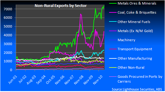 Breaking down non-rural exports a little further we can see that exports of metals, ores and minerals rose to a record high while exports of coal, coke and briquettes rebounded which was evident in the export throughput from the Gladstone port over the month: