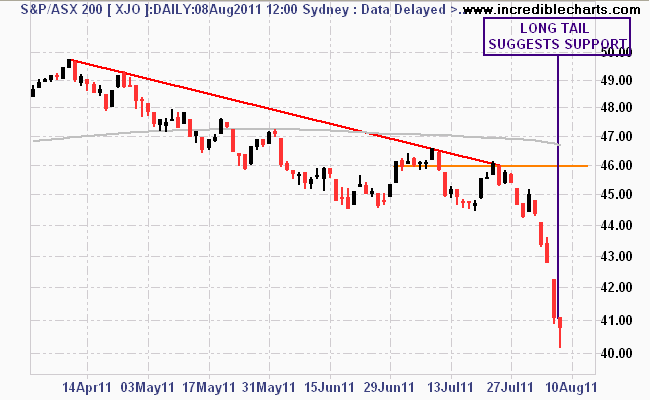 I’m reverting back to a daily chart because it might give some hope. Even though the market went down 2%, there is a slim possibility of a “surprise” rebound in the days to follow. The long tail on today’s candle is usually the precursor to a stabilisation, or an arrest at least in large price falls.