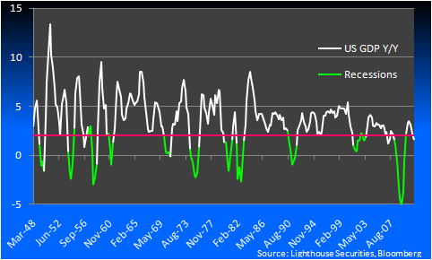 Since 1948, every time the four-quarter change has fallen below 2 percent, the economy has entered a recession.
