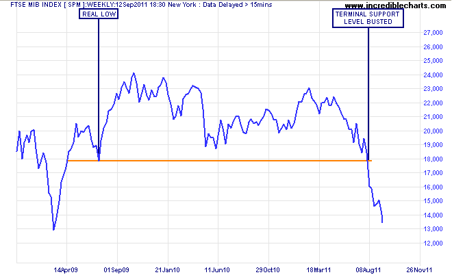 The weekly chart below shows the failure of the trendline from the March 2009 start of the bear market rally (which finished in May last year):
