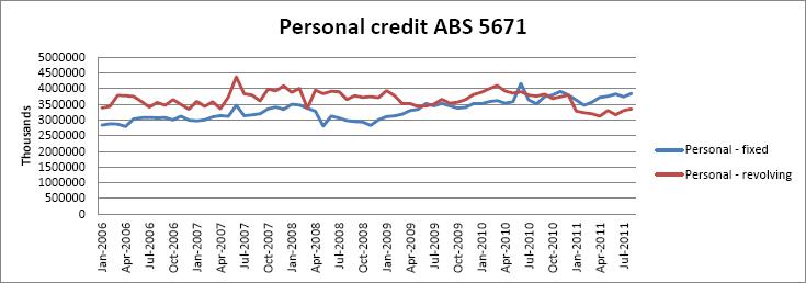 We know that the bounce in mortgage data is almost exclusively refinancing based. But the ongoing recovery in personal finance is interesting as the chart above shows, revolving credit (cards) is still very subdued but fixed loans (for the most part cars) is travelling quite nicely now. To my mind, the August bounce is pure interest rate relief.