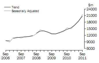 The trend estimate for Mining rose 16.5% in the September quarter 2011. Buildings and structures rose 16.9% and equipment, plant and machinery rose 10.2%. The seasonally adjusted estimate for Mining rose 22.1% in the September quarter 2011. Buildings and structures rose 27.1% and equipment, plant and machinery rose 5.0% in seasonally adjusted terms.