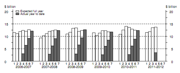 And now for the expected expenditure estimates. The clear bar is the estimate made each quarter for the year as a whole and the coloured sub bar is the actual expenditure. First, mining:
