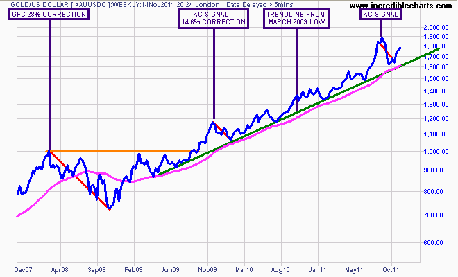 A technical explanation – I use a combination of short term patterns and indicators to formulate a trading position. The August high was captured by what I call a “KC Signal” and confirmed by the falling wedge pattern (note the two converging, falling red trend lines). The target for any correction in gold (i.e the price at which you should cover your short!) is its long term moving average and trend line, marked in pink and green respectively.