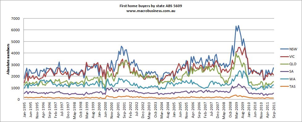 It’s probably a fair point. The exemption rises 10% per year each subsequent year to 50% in 2014 which isn’t exactly pump priming the market up front, though it surely is still a form of stimulus. The Real Estate Institute of Victoria (REIV) has a reputation for uber-bullishness so I can’t help wondering what it means when they start highlighting bearish statistics? Of course it may not have been the REIV that pitched the story into the HS. Perhaps the paper came up with it themselves, including the ABS data calcs. Nonetheless, the REIV has participated and it’s pretty clear that they are looking for: more help. And no wonder, here is the chart of FHBs by state: