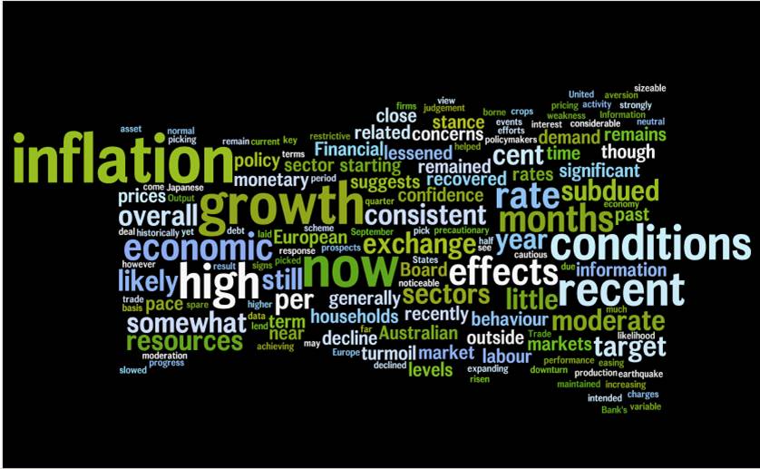 The RBA today signaled the start of an easing cycle, not simply a one off move in the cash rate. The rhetoric that they used was heavily slanted toward the risks associated with the current economic outlook with only a passing glance at the once dominant mining engine. Equally, as you can see in the Wordle pictogram of the statement that inflation is the key theme and trigger, its emphasis illustrating previous importance and its subsidence allowing the concerns for the future to predominate.