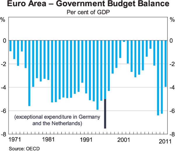 Government debt in the euro area had been rising as a ratio to GDP, however, for much of the period since the 1970s (Graph 1). This occurred because governments loosened fiscal policy during recessions but did not fully reverse those policies during the subsequent cyclical recoveries. In aggregate, budgets in the countries that now form the euro area have been continuously in deficit for the past 40 years (Graph 2). Clearly, there was no fiscal rule that aimed to balance the budget over the economic cycle, as there is in Australia.