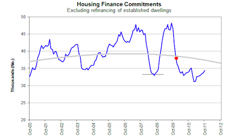 The red dot on the chart is the point where housing finance approvals need to get to in order to attain capital growth equating to inflation and naturally, meet our bullish scenario forecast for 2012. So clearly, we are not there yet and we will need to reach the red dot by June next year in order for our bullish scenario to play out.