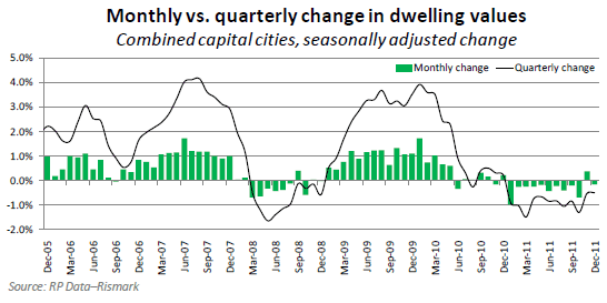 Second, below is a chart showing the combined monthly versus quarterly change in seasonally adjusted dwelling values: