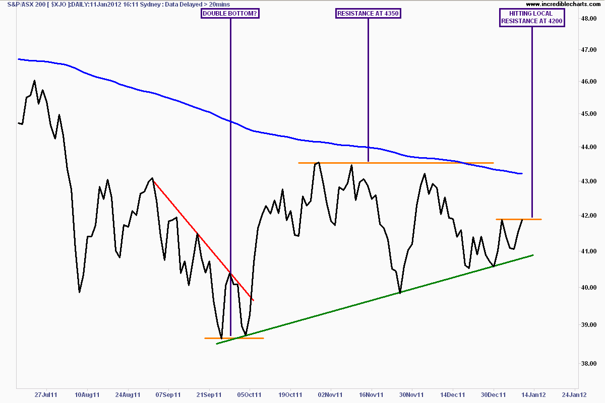 On the weekly charts the market looks like a coiled spring, and has not yet broken above its downtrend since April 2011: