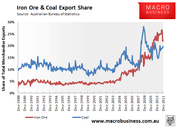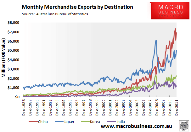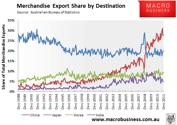 As stated many times before, the primary reason behind the explosion of Australia’s iron ore exports and terms of trade needs to look no further than China, which in December received nearly 30% (or $7 billion per month worth) of Australia’s total merchandise exports, up from only 5% in 2000:
