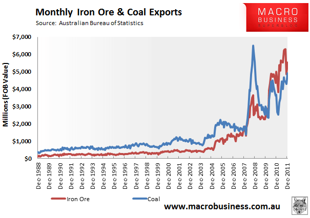 The below chart shows Australia’s two major commodity exports – iron ore and coal – with both below their peak levels: