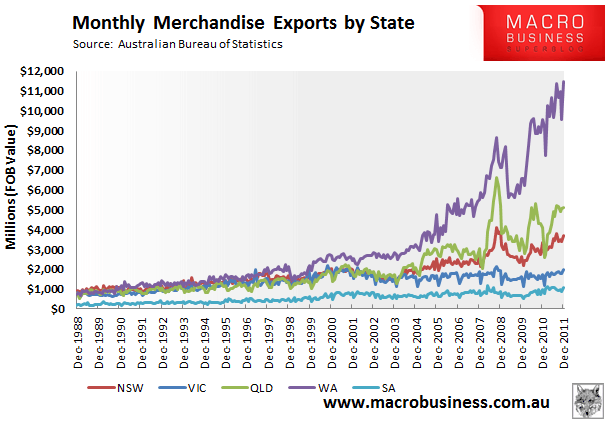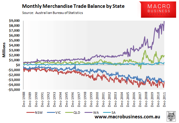 Moving on to the states, and you can see a continuation of the two-speed economy at work. The key resource states of Western Australia and Queensland are both dominating Australia’s exports and running large trade surpluses. By contrast, the two largest states – New South Wales and Victoria – are running large trade deficits, with Victoria’s export performance also lagging owing to its lack of mineral wealth: