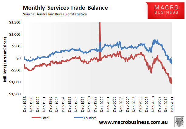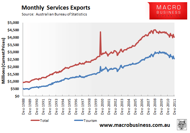 Finally, you can see the deterioration in Australia’s services export, which have been trending down since late 2008 on account of the high Australian dollar: