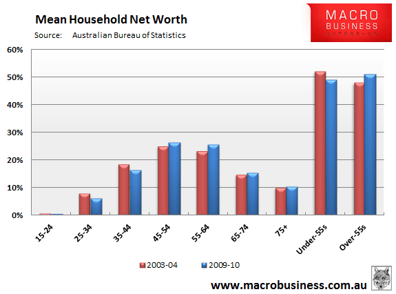 According to the ABS, over-55s held 51% of the nation’s net worth in 2009-10, an increase of 3% since 2003-04. Not surprisingly, this increase in the share of wealth was on the back of housing, where net worth for the over-55s rose to 53% in 2009-10 from 48% in 2003-04: