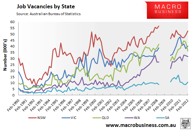 Counter-intuitively, job vacancies fell in the mining states and rose in the non-mining states: