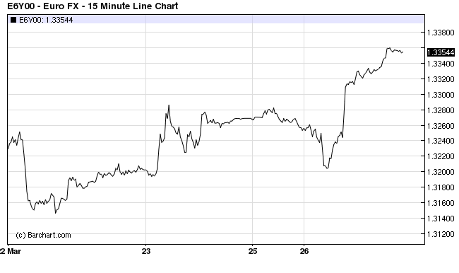The Euro (EUR/USD) jumped to 1.335 on the move, building on gains made since the start of the year, with support at 1.30 against the USD. The intraday chart below shows the picture: