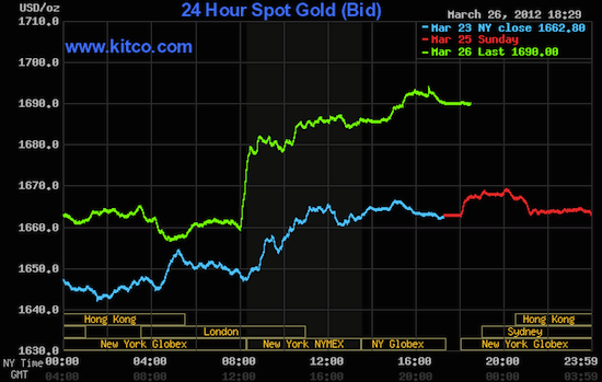 Gold (in USD) had a big night, jumping $30USD an ounce on The Bernank’s comments to $1690 where it is making gains at the start of the Monday session here in Asia. Here’s the overnight chart, where it passed the $1665 level I explained yesterday it needed to make headway against the short term dominant downtrend: