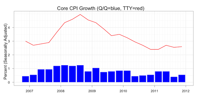 In rough terms, a quarterly print of 0.8 for the first quarter of 2012 would leave the annual rate largely unchanged at around 2.6 per cent (because the lapsing quarter would be the same as the new quarter). For this reason, I suspect the threshold is a quarterly print of 0.8 or lower, even though a print of 0.8 per cent represents an annualised rate of 3.2 per cent, which is above the target band.