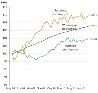 - Economic downturns typically do not impact significantly on the number of people employed in part-time work; whereas they typically have a significant impact on the full-time jobs to population ratio (ie. there is nothing new here).