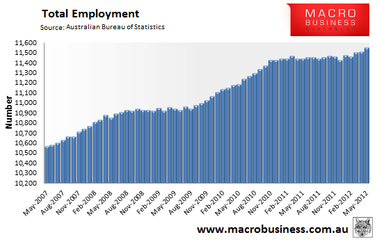 The total level of employment in Australia has again reached an all-time high, surpassing last month’s peak: