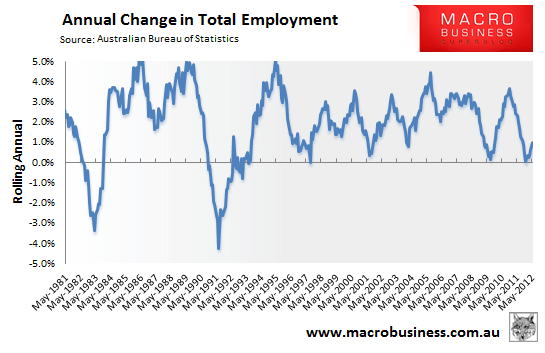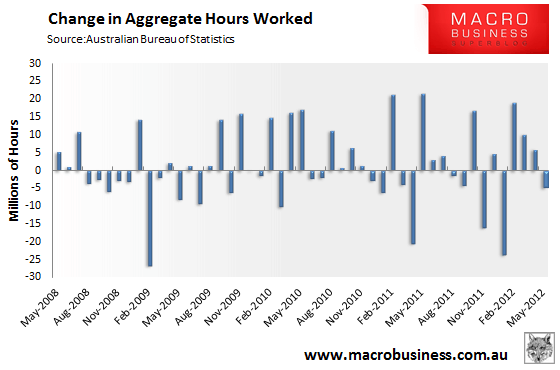 The annual change in aggregate hours worked has also increased marginally – up 0.9% in the 12 months to May 2012, with Western Australia leading the charge (up 6.1%):