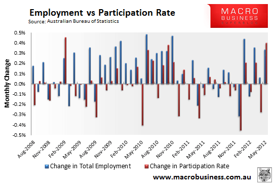 Despite the creation of 38,900 jobs – and increase of 0.3% – the headline unemployment rate rose by 0.1% to 5.1%. This is primarily because the labour force participation rate by 0.4%, more than ofsseting the employment gain (see below chart).