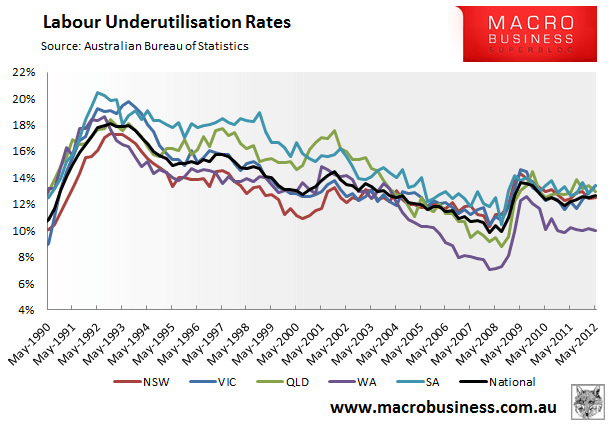 Another negative is that underemployment, as measured by the labour underutilisation rate, rose marginally by 0.1% to 12.6%, led by Victoria (13.4%) and South Australia (13.4%), with Western Australia (10.0%) bucking the trend: