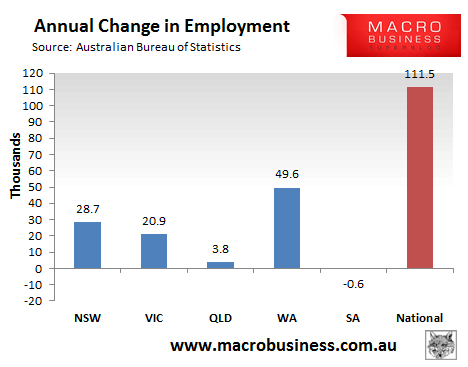 Over the year, however, Western Australia has dominated, contributing 45% of Australia’s new jobs: