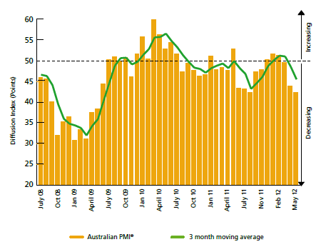 Manufacturing activity deteriorated further in May, following its sharp fall in April. The seasonally adjusted Australian Industry Group-PwC Australian Performance of Manufacturing Index (Australian PMI®) fell 1.5 points to 42.4 (readings below 50 indicate a contraction in activity with the distance from 50 indicative of the strength of the decrease). The May reading is the lowest since September 2011.