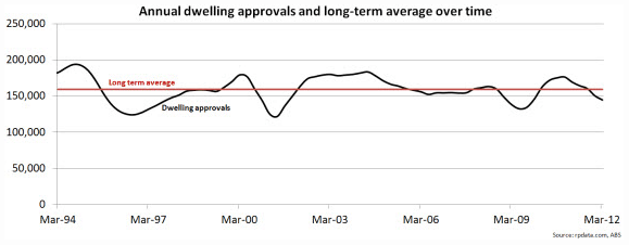 Dwelling approvals peaked over the 12 months to September 1994 with 193,754 new homes approved for construction over the year. Over the 12 months to March 2012 144,594 new dwellings were approved for construction which was -25% lower than the historic peak but also -9.1% lower than the long-term average of 159,043 approvals each year.