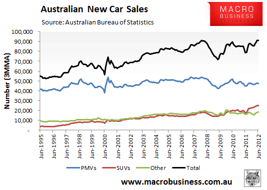 Despite the monthly dip, the below charts show that the trend in new car sales is well and truely up, driven by strong growth in sales of Special Utility Vehicles or SUVs (4WDs):