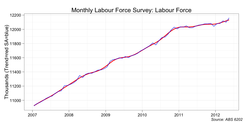 If the labour force had continued to grow at its usual pace, the small bump in the unemployment rate in calandar year 2011 would have been of a similar size to the jump in 2008-09. It would have jumped some 1.7 percentage points off a base rate of 5 per cent. That is to say, the unemployment rate today would be something like 6.5 per cent (trend); and not 5.2 per cent as currently reported.