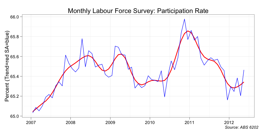 If the labour force had continued to grow at its usual pace, the small bump in the unemployment rate in calandar year 2011 would have been of a similar size to the jump in 2008-09. It would have jumped some 1.7 percentage points off a base rate of 5 per cent. That is to say, the unemployment rate today would be something like 6.5 per cent (trend); and not 5.2 per cent as currently reported.