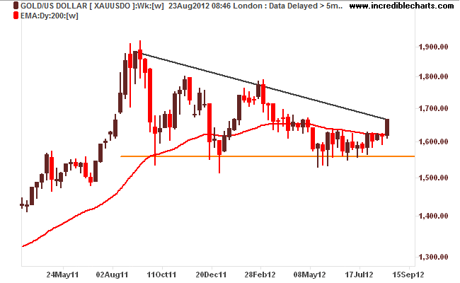 Gold (USD) keeps on moving up, breaking out of its sideways funk, now at $1665USD per ounce, moving up in AUD terms too, but slower at $1583AUD per ounce. All the precious metals are on the move, and most traders would have long positions by now, at least on a daily basis (as we do at Macro Investor, hedged via silver) – but here’s the weekly chart of gold for some perspective:
