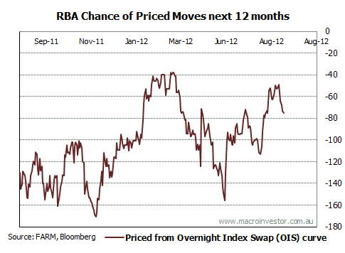 While the equity markets sail blithely on, there are signs that the crunch under way in Australia’s terms of trade is beginning to strain interest rate markets. The Credit Suisse rate futures market for the next twelve months has added more than one cut in the past week or so: