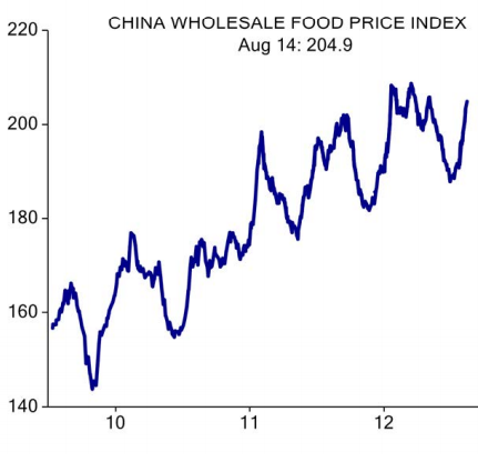 China’s Ministry of Commerce blamed the increase in vegetable prices on “strong winds and rainfall in the country’s eastern regions” that “disrupted production and logistics.” Nevertheless vegetable prices are up 15.4% over the past four weeks.