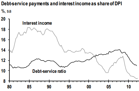 Interest income as a percentage of disposable personal income (DPI) on the other hand had declined dramatically, far outpacing the decline in debt-service ratio. Consumers are not benefiting from the lower debt burden because their savings accounts are not paying them anything.