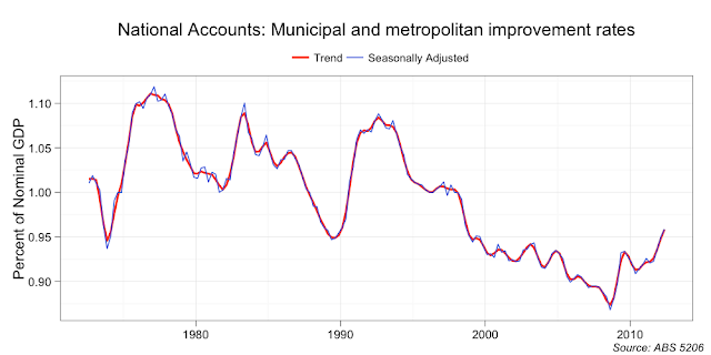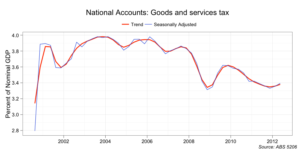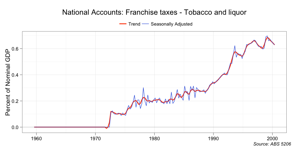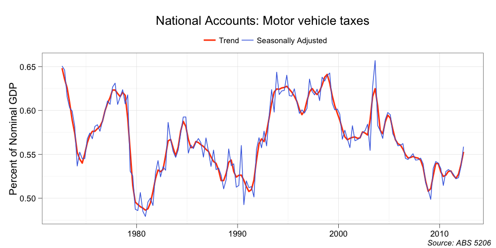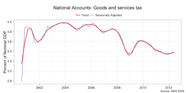 For completeness, attached are a set of charts from table 18 in the National Accounts, with the tax take presented as a proportion of nominal GDP for the quarter. Enjoy!