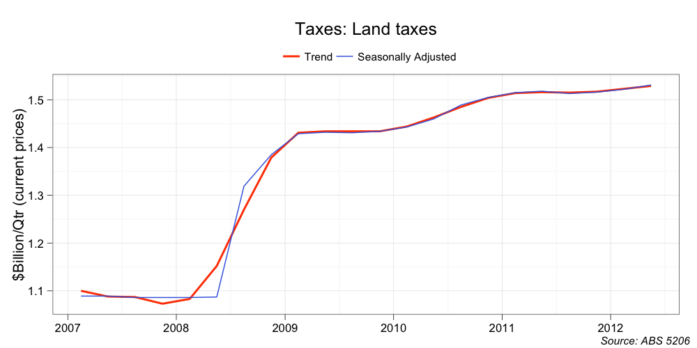 Table 18 of the National Accounts gives us a window on government revenue. The growth rate in the revenue from the various sectors of the economy gives an indication on whether those sectors are doing well or not. I will limit the following analysis to the GFC and subsequent years – and those categories I found a little interesting.