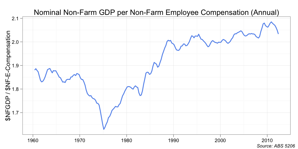 Last time I only looked a the data in annual terms (summed four quarters non-farm GDP divided by summed four quarters non-farm employee compensation). So we will start with the annual charts.