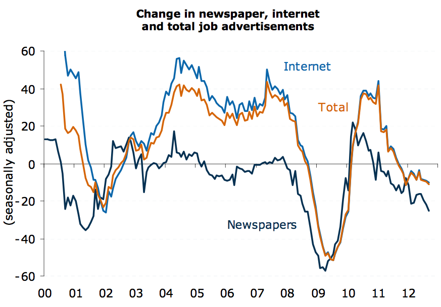 • Consistent with some recent project delays and cancellations in the mining sector, along with falls in the prices of Australia’s key commodity exports, newspaper job advertisements in the mining states of Western Australia and Queensland declined in September. The Northern Territory is the exception to this, although its monthly advertisements are typically very volatile. In each of these regions, however, newspaper job advertisements are now in trend decline.