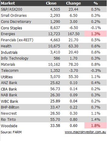 The permabulls are prancing around with glee today, and this time it was energies turn to shine – up 1.3% on the back of Woodside (WPL) mainly, although it remains one of the more depressed sectors: