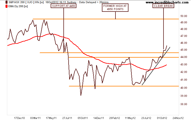 We’ve now had a clear break on the weekly chart too – one day does not make a new trend, but its hard to resist this move when others like BHP, WPL (which rose on an increase in its production forecast) are moving up. Here’s the materials sector weekly chart – pretty obvious setup here, and I’d rather this than financials which are WAY overbought:
