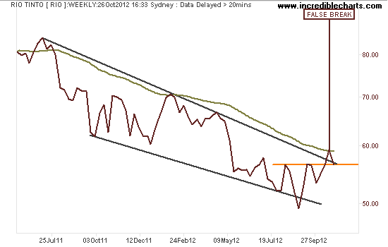 In the ASX8 (the top four miners and banks), Rio Tinto (RIO) was the worst, swapping yesterday’s comparatively good performance with a drubbing. Here’s the weekly chart to show you the false break and retracement back to former resistance now support (the orange line):