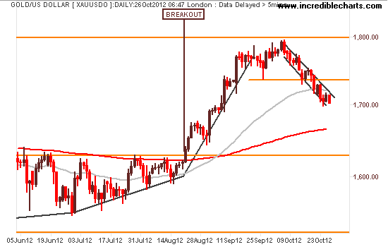 Gold (USD) remains weak and its short term downtrend continues in a tight channel with no sign of a reversal yet – $1630AUD is the target here: