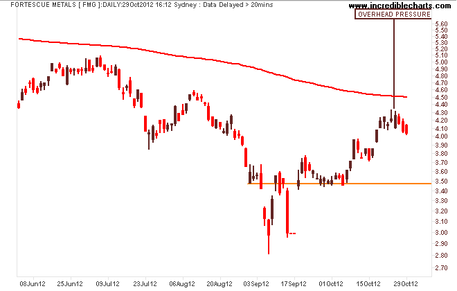 Iron ore extractor Fortescue Metals Group (FMG) might be putting in a short term top with some overhead pressured in the last week as it comes back to $4, following the iron ore price: